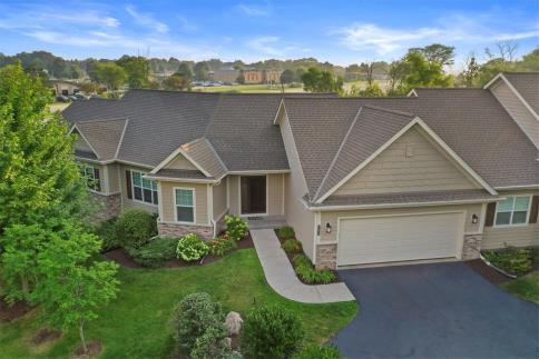 Enjoy pond views & upscale finishes in this meticulously maintained 3 BR, 2 BA RANCH condo—an end unit in a quiet triplex. Hickory engineered wood floors flow throughout the open layout, w/ceramic tile in baths, mudroom & laundry. Chef's kitchen features granite counters, soft close painted cabinets w/pullout drawers, lge island w/BB & sunny DR, all open to a LR w/floor-to-ceiling stone GFP & balcony access. The spacious primary suite boasts dual vanities, oversized tile Shower and WIC. BR 2 has pond views, WIC & adjacent full BA. BR 3 is ideal for a home office. Mudroom off epoxy-finished garage leads to separate laundry with utility sink. Exposed lower level with HIGH CEILING, multiple full-size windows & full BA rough-in. Prime location near Sendik's Plaza & Mr. B's Steakhouse! Pets OK