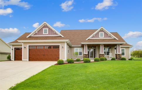 Custom designed 4 bedroom ranch in Reflections Village blends modern design with popular craftsman elements. Great space for both daily living and entertaining! Fantastic curb appeal leads to open concept floor plan including gourmet kitchen with huge quartz island, main floor beverage bar, real maple hardwood floors, mudroom with 5 lockers, office. Master bedroom retreat includes amazing spa bath with oversized shower stall with 2 heads, walk-in closet and dual quartz vanities. Finished lower level with posh theatre room includes everything you need for Netflix binge watching/future Packer games including stadium recliners. Top-of-the-line granite wet bar in family room. Enjoy summer on the stamped concrete patio featuring 2 pergolas, fire pit, lounge area and built-in grill. Friendly subdivision with paved walking paths. Ideal location for speedy freeway access. This one checks ALL the boxes!