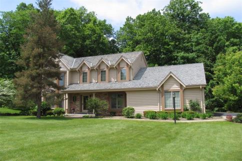 Lot offers a happy mix of lush greenery, woods and yard that allow you to enjoy nature from the very private paver patio while the kids play in the yard! Big, beautiful kitchen boasts abundance of cabinets, granite counters with breakfast bar, tile backsplash, stainless steel appliances and window wrapped dinette. Newly refinished oak hardwood floors throughout most of main floor add character to the home. Family room has gas fireplace and opens to living room through French doors. Elegant formal dining room is ready for your family gatherings. Upper loft offers office/study space including built-in desk and bookcase. Vaulted master suite includes a walk-in closet and private bath complete with dual sinks, tiled shower with updated glass surround and plumbing fixtures, bath tub and skylight. 2 other good-sized bedrooms share full bath. Newer furnace, central air, water heater and upper windows. Quiet, family friendly area yet close to shopping and schools!